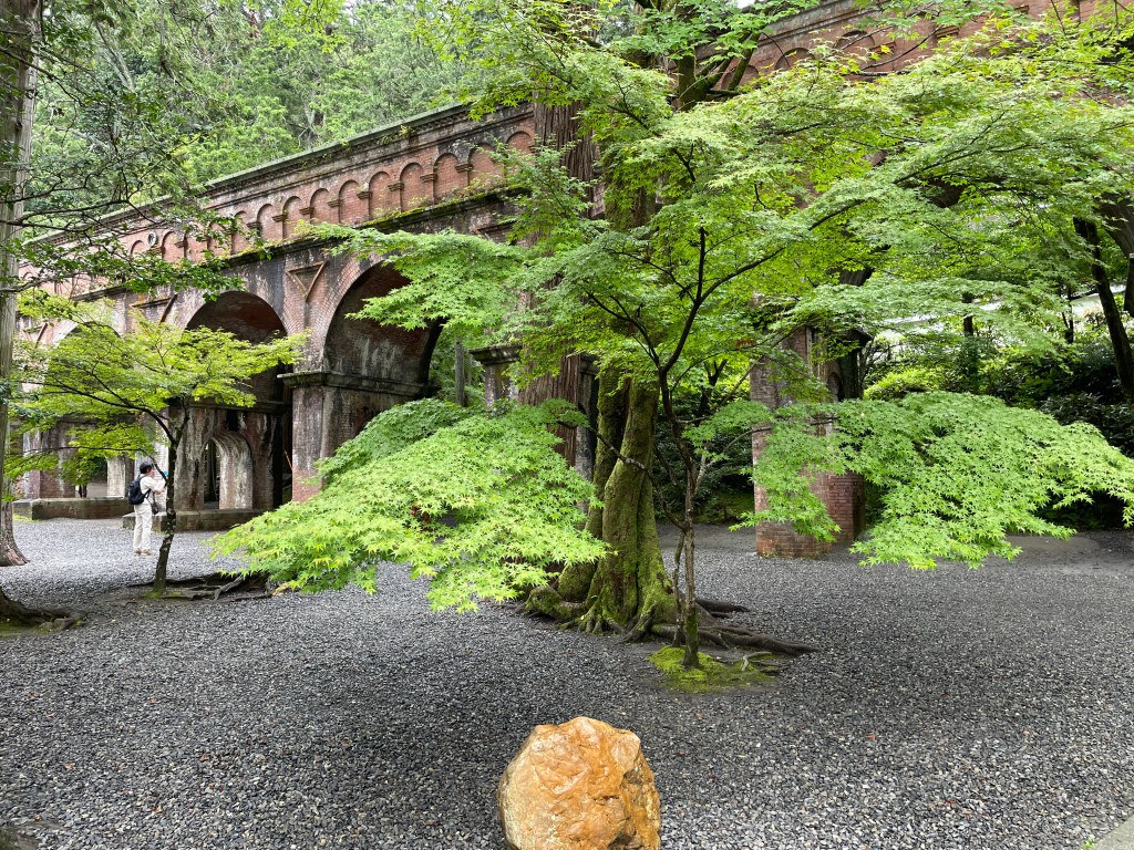 目的地1つ目の『水路閣』南禅寺の境内内にあります。古いお寺の中にレンガ積みの水路。緑豊かなもみじとの風景が最高でした。